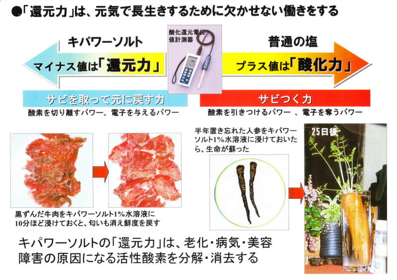 疲労、老化、病気の根源といわれる体のサビ(酸化)を元に戻す力、それが還元力です。活性酸素をキパワーソルトに豊富に含む金属元素が、電子を放出することで分解、消去します。